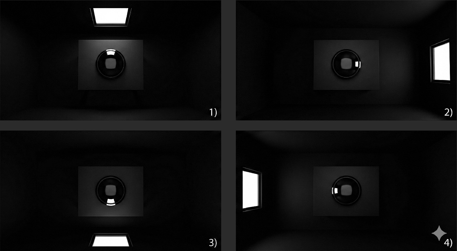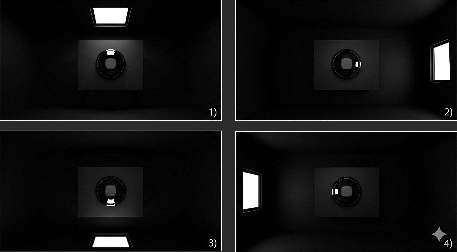 输入图片如下所示,是四张组合在一起的子图。拍摄的内容是桌子上的一个黑色且表面光滑的扁球状物体,放在一个有4扇窗的无灯光房间里。每次只打开一扇窗,拍摄4张照片。