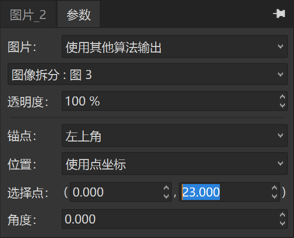 这里的主要技巧是,将图片工具的锚点设置为“左上角”的同时,将位置参数设置为“使用点坐标”,并维持选择点参数的坐标为(0, 0)。此时,图片工具显示的图片就会被放置于画布紧靠左上角的位置,即图像拆分工具输出的第一个子图的位置,完全重叠。
